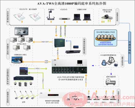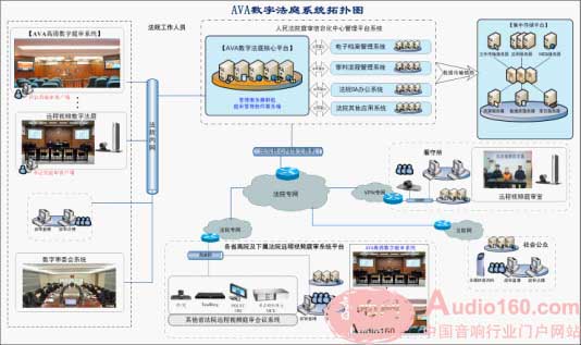 法院審判法庭按大小設計分為大法庭、中法庭、小法庭,而按職稱則細分為刑事庭、民事庭、少年庭、調解室等,數字法庭系統的建設同樣以此區分,我們稱之為AVA數字庭審系統---數字化大法庭、數字化中法庭(刑事庭、民事庭)、數字化小法庭(刑事庭、民事庭)。本方案則按照大、中、小法庭進行設計高清數字法庭系統,如上圖所示,以法院中心機房的數字法庭庭審管理軟件服務平臺為核心,建有數字庭審系統的法庭為節點,利用法院專網為媒介進行數字化的視音頻傳輸,本地與遠程法院、看守所、公眾按照應用權限進行相應的操作,如:在本地管理員可以進行庭審控制、應用管理、權限設置、庭審排期、查詢、直播點播等;而遠程法院可通過本地管理員給予的權限進行庭審遠程觀摩、指導、交流等;看守所則在法院需要進行遠程提審的時候,利用數字庭審系統與遠程的看守所進行實時的遠程交互開庭;法院可根據實際的需要把一些經典案例,通過數字庭審系統把案件上傳至法院官網上,讓公眾進行瀏覽。