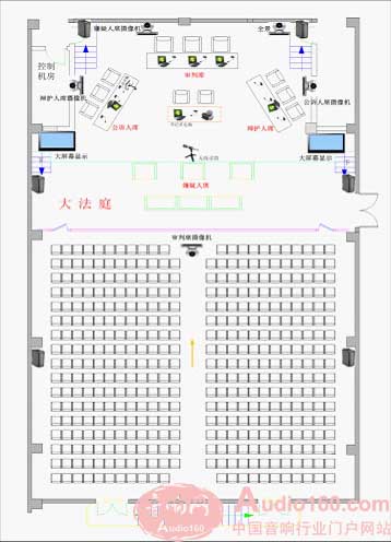 法院的大法庭一般會作為多功能法庭使用,審訊時為法庭、開大型會議時為會議室、聯歡晚會時又可作為舞臺等功能;法院的中法庭分為刑事庭與民事庭,其面積大約有150-200平方米左右;法院的小法庭同樣也分刑事庭、民事庭、少年庭,其面積大約有80-100平方米左右。三者的點位布局均安照法庭內的席位進行設計,便于各個席位的視音頻采集。