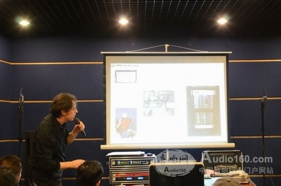 Massimo Polo先生在杭州浙江電視臺審聽室為專家介紹WisyCom產品特點