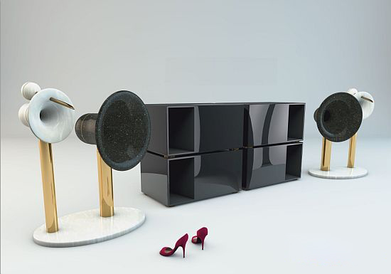 Equilibrium高音前延伸導管前開口角度是經過精密的計算,使高音的水平與垂直擴散角非常寬,而且由于導管是下傾式前延伸的設計,導管開口剛好與下面的18寸中低音號筒中心重疊,這樣的布置可使各號角的發聲高度齊平,在號角喇叭設計中首次實現高中低音實現同軸點音源的理想發聲狀態,產生精確的聲場和定位,使無論在任何使用環境也能提供最理想的聆聽效果。整座喇叭主體包括號筒都為天然石材打磨而成,機腳及構件都為為合金精鍍金工藝,機座為同材質的天然石料制造。承載功率200W。