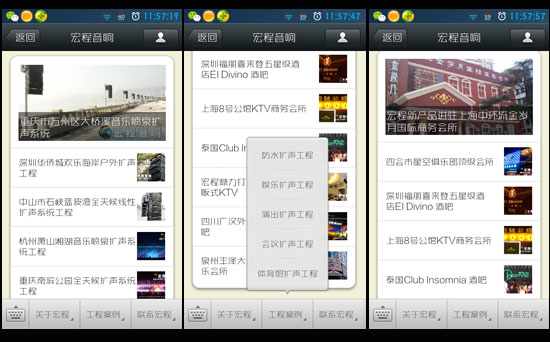 “工程案例”為案例介紹服務功能,目前下設“ 防水擴聲工程”、“娛樂擴聲工程”、“演出擴聲工程”“會議擴聲工程”“體育館擴聲工程”五個二級菜單,客戶可以通過微信以最快捷的方式查詢宏程公司經典工程案例。