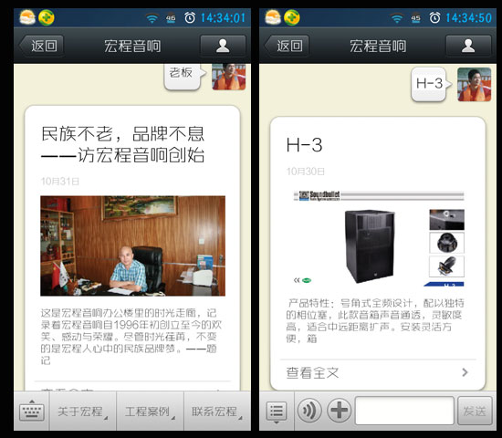 繼開通新浪官方微博后,宏程音響在今年7月就開始測試官方微信。8月5日微信升級為5.0版后,依托該版本的新理念、新功能,公司企劃部緊張開發和調試,正式推出了官方微信公眾平臺。