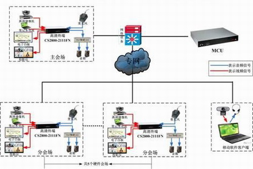 系統(tǒng)架設基于鐵四院現(xiàn)有的4M專線,在武漢鐵四院總公司架設華平MCU服務器,采用單MCU星型結(jié)構(gòu),統(tǒng)一管理;各高清終端會場配備一臺AVCON觸控式數(shù)字交互平臺,便于會場之間審圖、圈閱和修改;分會場并配備一個軟件點,用于控制和備份。主會場位于武漢城地院會議室,各分會場之間相互連通,支持數(shù)據(jù)雙流,實現(xiàn)1080P全動態(tài)高清視頻傳輸,在沒有主會場參與的情況下也可以召開視頻會議。