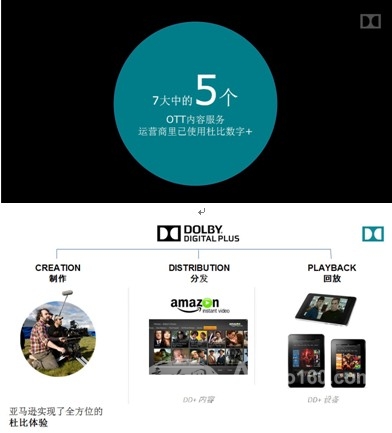 從內容制作端來說,中國7大OTT內容服務運營商里已有5家使用了杜比數字+技術,包括百視通、華數、未來電視、樂視、PPTV。亞馬遜更實現了全方位的杜比體驗。正如其CEO杰夫•貝佐斯所說:“我們想要做得更好,所以選擇了杜比數字+技術。這是杜比用于高端家庭影院系統的聲音技術。它帶來的效果是巨大的,非常值得。”