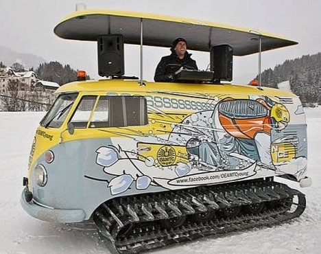 據美國autoevolution網站消息,日前奧地利人為一輛1966款大眾T1面包車安裝了BombardierB01Spurgrat的雪地坦克履帶,使其成為一個大腳怪物。該車被改裝成敞篷版,搭載福特Taunus發動機,并且安裝了一個DJ臺。