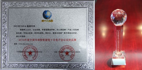 2013年12月6日, 2013年度(第八屆)中國市場智能建筑十大品牌頒獎盛典在京盛大舉行,舒爾旗下DIS 獲評“2013年度智能建筑十大會議系統品牌”。本次評選活動由中國勘察設計協會工程智能設計分會主辦,主要根據品牌技術先進性、市場占有率、品牌知名度、性價比、服務與信譽等各個層面進行綜合評比。