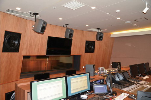 另外,控制室中除了真力音箱,其左右兩側(cè)還嵌墻安裝了德國(guó)廠商MusikelectronicGeithain的大型三分頻RL 901K監(jiān)聽(tīng)音箱。近場(chǎng)監(jiān)聽(tīng)使用一對(duì)小尺寸的Adam Audio A3Xs,放置在調(diào)音臺(tái)上方的DK Audio MSD-600M電平表兩側(cè)。在現(xiàn)場(chǎng)配音室內(nèi),一對(duì)Yamaha MSP7s為配音演員們提供監(jiān)聽(tīng)。
