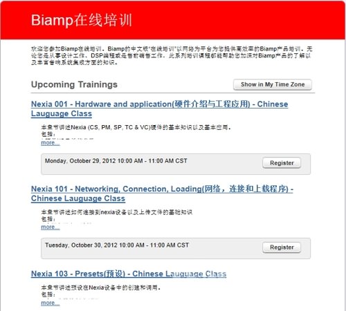 2. 您將看到BIAMP Nexia 培訓注冊界面:找到您想要報名的課程及時間,點擊“Register”進行注冊報名。