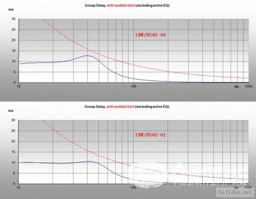 群延時在某種程度上代表了瞬態,普遍認為,群延時低一些,瞬態好一些。舊款8545-00的低頻瞬態是比較普通的,從比對看,完全一樣的箱體,僅僅是換了新款8545-01單元,群延時的表現也好一些了。這在另一個側面證明了新款8545-01的瞬態會有一定程度的改善。(不要期待過多的改善,那將會是另一個單元,我想喜歡8545聲底的玩家應該不會滿意的。)