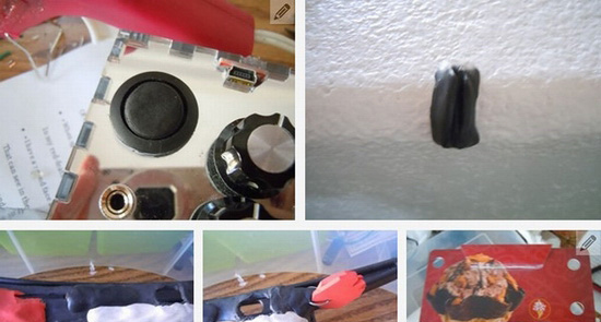 現在開始膠合,先用膠把USB,音頻插孔和插座的開/關都粘好徹底固定住,然后用熱膠把箱子整體粘上。在箱體每一側關節上都上好膠,并把它們壓在一起,等膠水干了之后,用小刀把周圍殘留的膠水清理干凈。兩個箱子都粘好以后,把其中一個較小的箱子側面涂上膠水,將它粘到另一個較大的箱子里面,揚聲器的電線要保證能穿過兩個箱子。