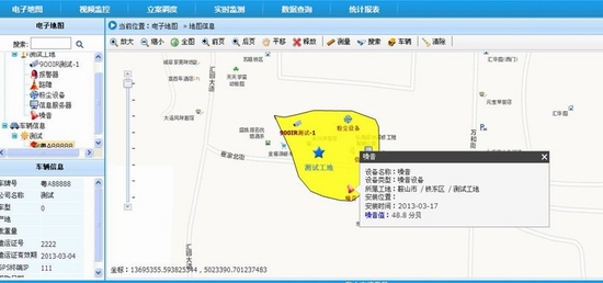 系統支持即時查詢功能,可通過該體系統實現對“街道名稱”、“所屬區”、所屬街道、手動拉框等快速定位查詢,并顯示周區域工地運行情況,或報表形式顯示該區哉工地的各類數據采集信息、或報警信息。