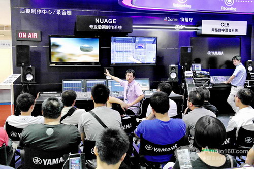 位于 NUAGE 講座演示區一旁則是著名的 CL 網絡數字系統。CL 系列數字調音臺一經推出以來,即受到業界的廣泛好評,在世界范圍內,包括眾多大型演出活動、高端峰會以及體育賽事的現場混音與轉播工作等等均大量使用 CL 系列數字調音臺。新近落成的北京網絡廣播電視臺高清演播廳更是使用了 2 臺 CL3 以及配套 Rio 機架接口箱來完成節目音頻的轉播工作。在本次 BIRTV 展會中,針對廣電領域的節目制作流程,雅馬哈提出了具備高度網絡化與超大通道容量的一站式高清制作解決方案。該方案利用目前業界廣泛贊譽的千兆級 Dante 音頻傳輸網絡實現多通道、低延時的高清音頻傳輸,從而將演播室內的 CL 系列數字調音臺與后期制作中心內的 NUAGE 后期制作系統結合為完整的 “擴聲+轉播+錄制+制作” 系統,后期混音師將實時獲得現場高品質數字音頻信號并通過 NUAGE 系統同步錄制節目內容,在不影響節目錄制的情況下隨時監聽指定通道,并可以實時完成多通道電平的初步調平工作。對于5.1等大型高清節目來說,該方案無疑大大節省了節目制作時間,提高了整體工作效率。