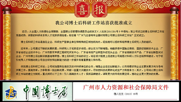 近年來,公司通過不斷的發展積累,科研和人才優勢逐步體現,綜合實力不斷增強。相繼獲得中國馳名商標、國家級高新技術企業、廣東省省級企業技術中心、廣州市數字聲頻工程研究開發中心、廣東省傳統產業轉型升級龍頭企業、廣東省高新技術產品、廣東省創新型試點企業、廣州市博士后創新實踐基地等榮譽。博士后科研工作站的設立,將在很大程度上促進我公司高層次科研人才隊伍培養和建設,對于吸引優秀人才和推動我公司自主研發和創新能力的進一步提升有著重要意義和作用。