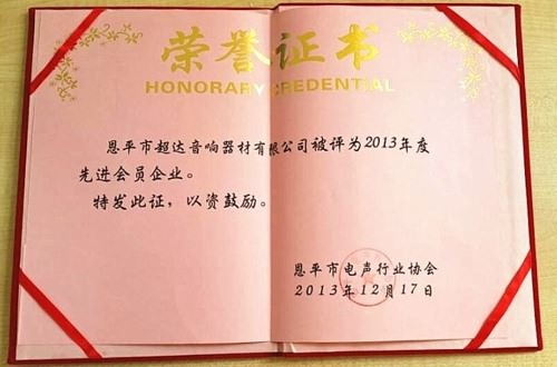 2013年12月17日恩平市電聲行業(yè)協(xié)會再度頒予超達音響榮譽證書。