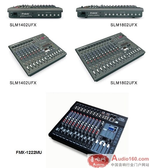 廣州飛達(Fidek)再度推出升級版全新設計調音臺:SLM-1802UFX錄音調音臺,該型號是專門針對要求較高的大中型演出、多功能廳、會議廳等擴聲場所而設計的飛達中高端調音臺,一共有18個輸入通道,其中10路平衡\不平衡輸入,2路混合輸入,2路立體聲輸入(4通道)和2路輔助立體聲輸入;內置15種數碼聲場效果器,主輸出通道設7段均衡器,帶USB錄、放音功能,2路主通道輸出,2路立體聲錄音輸出和1路監聽輸出。整機外形硬朗,SLM1802UFX數字調音臺還榮獲了2014年PALM展專業音響類的產品技術進步二等獎。
