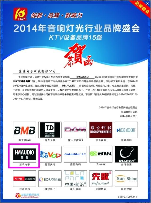 佛山慧鳴電子科技有限公司成功晉級2014年度慧聰音響行業(yè)十大競爭力品牌中“KTV設(shè)備品牌”評選15強!下一輪的晉級10強的競爭更加激烈!請繼續(xù)支持我們,一個一直堅持自主研發(fā)、堅持原創(chuàng)的中國制造型企業(yè)——慧鳴電子。我們一路向前,需要得到您的支持,您的肯定將為我們進軍“中國DSP音頻處理技術(shù)的領(lǐng)軍企業(yè)”這一目標提供源動力!