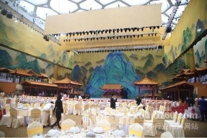 本次演出的現場設計,是將水立方內部改造后令其充滿中國元素。在舞臺上,亭臺樓閣小橋流水,四周懸掛黃色幕布,描繪中國山水,微風吹動,山動水流,頗有意境。