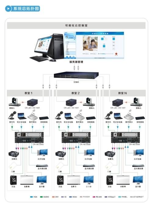 ‘化繁為簡,將控制簡單化、一鍵化”是CREATOR快捷高標(biāo)清混合平臺(tái)云中控系統(tǒng)的最高使命!該系統(tǒng)是專為教育行業(yè)度身定制,可實(shí)現(xiàn)對(duì)所有教室設(shè)備的網(wǎng)絡(luò)式集中管理監(jiān)控,如上課前遠(yuǎn)程開啟設(shè)備、下課后遠(yuǎn)程關(guān)閉設(shè)備、監(jiān)控所有教室設(shè)備的具體狀態(tài),如:燈光開關(guān)、投影機(jī)開關(guān)、投影機(jī)燈泡壽命、設(shè)備安防報(bào)警等等。而為了滿足不同課室的差異性,CREATOR快捷網(wǎng)絡(luò)型高標(biāo)清混合主機(jī)CR-NET2000采用插卡式設(shè)計(jì),支持VGA輸入、DVI輸入及HDMI輸入,客戶可以靈活使用輸入和輸出卡視頻接口類型。輸入卡最多可以插4張,輸出卡最多可以插3張;其相對(duì)應(yīng)的音頻和MIC一同切換。