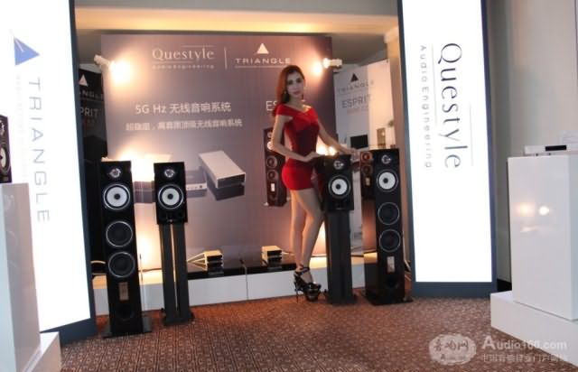 五樓展廳為5GHz無線音響系統的產品展示。法國三角音箱作為曠世音響的戰略合作伙伴,海外銷售總監Rune從法國波爾多到廣州參與此次展會。這是三角音箱的最新產品EZ系列首次在中國展示,現場演示則運用2對無線功放R200來驅動一對落地箱。啞銀色噴砂功放搭配黑色鋼琴烤漆的音箱,加上兩邊帶有曠世,三角的LOGO燈箱,現場效果堪稱完美。開展首日,展廳內一直人潮涌動,多次爆棚,吸引各路媒體爭相報道,拍照。