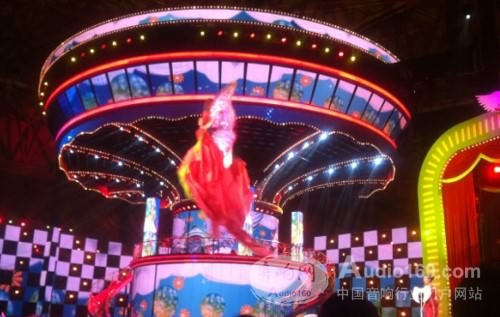 東方衛視2014群星新春大聯歡,主打溫情路線,以回家作為主題貫穿整場晚會。相比往年的春晚,東方衛視馬年春晚的舞臺設計將廣電總局的節儉風號召貫徹到底,大屏幕的數量被大幅減少,取而代之的是以旋轉木馬作為實體背景,緊扣馬年主題,側舞臺的頂部也有兩匹小馬與之相呼應,舞美設計可以用溫暖、簡潔來形容。東方衛視馬年春晚的彩排現場,藍紫色調的柔和光線配合恰到好處的LED設計給全場籠罩上一份柔和的色彩,“旋轉木馬”的大型多層舞臺與“飛馬百老匯”的拱門小舞臺構成了愛麗絲夢游仙境一般的起伏地形。如此夢幻游樂場,得益于浩洋電子JT160B、PT189B、V3000P、OK190Z、PT320B、V2000B、V2000W數千臺瞬息萬變和層次感十足的打造,可謂低調華麗。