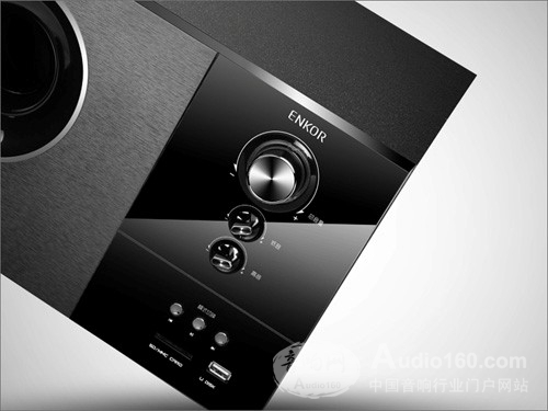 恩科S2880B的前置控制面板,采用時尚和質感的拉絲+鏡面表面處理工藝,前置超大型倒相孔,大型炫彩調節主音量調節旋鈕,讓整個音箱顯得高端、時尚和質感十足。配合主音箱低音單元的5.25英寸的長沖程設計,恩科S2880B的衛星箱單元采用3英寸的全頻喇叭,中高音醇厚自然。衛星箱的造型簡約、大氣、渾然一體。