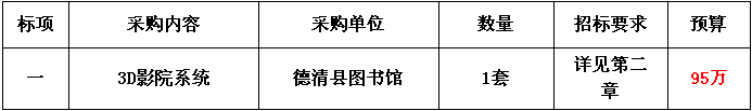 根據《中華人民共和國政府采購法》等有關規定,德清縣政府采購中心 受德清縣圖書館 委托,就3D影院系統項目 進行公開招標,歡迎國內合格的供應商前來投標。