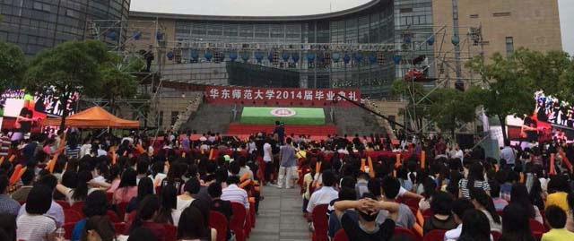 此次畢業典禮為華東師大首次露天舉辦,匯聚了全校各院系5000余名師生。畢業晚會于下午6點舉行,在星空燦爛的圖書館草坪,精心準備的各式歌舞陸次登場,新穎別致的真人秀“大廚去哪了”、包含真情的小品“夢想”、富蘊深意“夢想驛站”交接儀式等無不彰顯出華東師大人獨有的性格和魅力。
