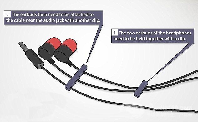 于是Robert Matthews嘗試將耳機腔體的兩根線使用夾線器固定,然后再將音頻插頭與這兩根線再使用夾線器進行捆綁,如此一來耳機線的兩端都被固定,就能避免耳機線纏繞。簡單地說,這終結了耳機線的自我循環,也就不會形成容易產生繞線的回路。