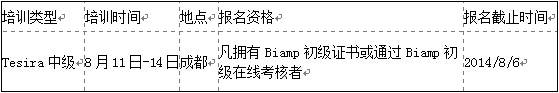 Tesira中級 8月11日-14日 成都 凡擁有Biamp初級證書或通過Biamp初級在線考核者 2014/8/6