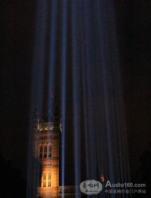 為紀念英國在第一次世界大戰中向德國宣戰100周年,由旅居法國的日本藝術家池田亮司設計的藝術作品“光譜”4日晚開始在泰晤士河畔議會大廈旁展出。作品由49個投影和音響裝置組成,向天空射出49根光柱,這一展示將持續7天。