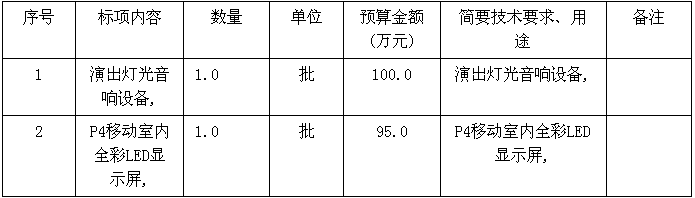 根據《中華人民共和國政府采購法》等有關規定,浙江省政府采購中心受浙江曲藝雜技總團有限公司,省喬司監獄委托,就顯示屏、燈光音響進行公開招標,歡迎國內合格的供應商前來投標。