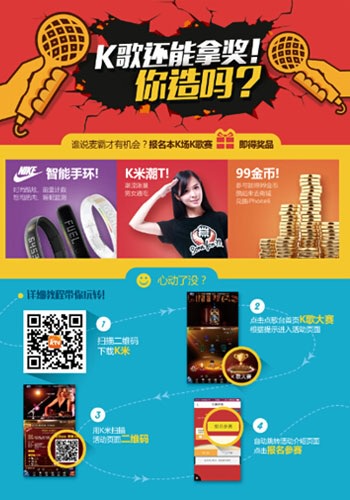 依托K米O20平臺的“聯網K歌賽”,為眾K場提供了多種多樣的運營方式,將手機端的用戶導流到K場中以引爆人氣。參與的K場不但可以單店舉辦K歌賽,也可以某個區域多店舉辦,甚至還可以全國的連鎖店一同舉辦,而他們只要通過K米O20的平臺,就能吸引到大批粉絲。