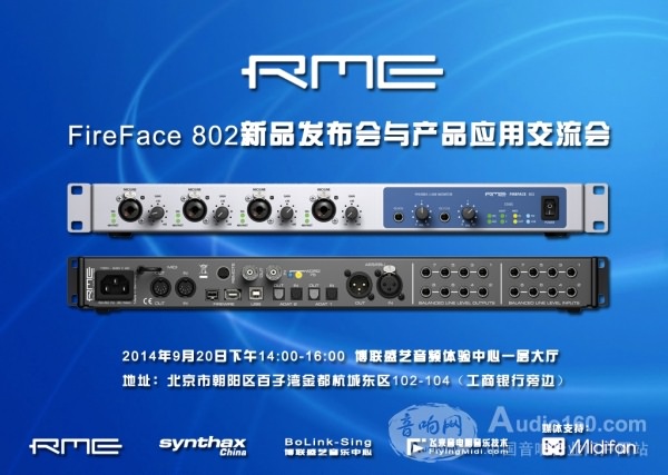 由RME中國辦事處、信賽思科技有限公司、博聯盛藝科技有限公司和飛來音電腦音樂技術聯合舉辦的RME FireFace 802新品發布會與產品應用交流會。博聯盛藝體驗中心是RME授權的正規經銷商和體驗點,廣大用戶和感興趣的朋友可以在此體驗和試用多種型號的RME產品。