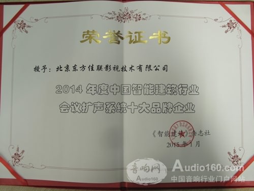 新春正伴著冬日的陽光緩緩向我們走來。2015年1月22日,“2014年度中國智能建筑行業產品系統品牌企業頒獎大會暨2015年中國智能建筑行業高峰論壇”在北京新大都飯店多功能廳召開。北京東方佳聯影視技術有限公司獲得了“2014年度中國智能建筑行業會議擴聲系統十大品牌企業”榮譽稱號。