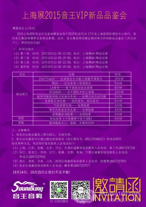 2015上海國際專業(yè)燈光音響展覽會將于2015年10月14-17日在上海新國際博覽中心舉行,屆時(shí)音王集團(tuán)將攜帶眾多新品參展,此外,音王集團(tuán)將在展會期間舉辦四場新品品鑒會(詳見如下),期待您的光臨!
