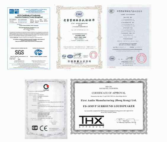 ▲飛達音響先后榮獲ISO9004、ISO14001、QC080000、CE、3C、UL、KTL、THX等標準認證