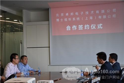 北京卓邦電子技術有限公司與博士視聽系統(上海)有限公司2015年10月15日,在BOSE博士上海總部簽署全國戰略合作協議。ZOBO卓邦總經理張新峰、副總張冰、華東運營中心總經理張誼斌,BOSE專業系統大中國區總經理封志剛先生、全國銷售經理李勇先生、業務拓展經理謝曉慶共同出席了本次簽約儀式。此次戰略合作協議的正式簽署,代表雙方將展開在多功能劇場劇院領域的全面深度合作。