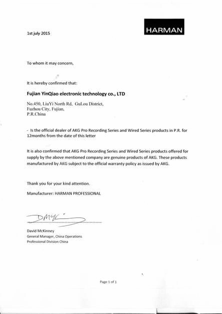 AKG專業(yè)錄音系列和有線麥克風(fēng)系列授權(quán)證書