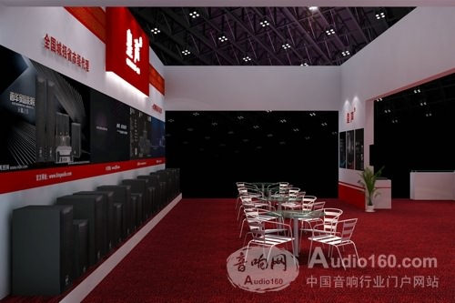 整個(gè)展臺(tái)的設(shè)計(jì)簡(jiǎn)約大方,重點(diǎn)突出公司的品牌名稱以及展示的產(chǎn)品。展板醒目的位置上方展示出了眾多的新品的照片,展柜整齊的陳列著產(chǎn)品樣機(jī),配合燈光的影效,音箱的質(zhì)感也得到充分體現(xiàn)。