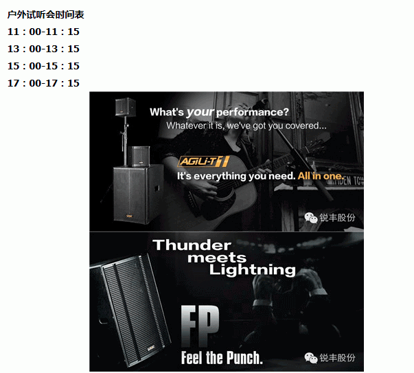 本次展會中,銳豐股份自創品牌LAX旗下流動演出專用的AT曲線陣列系列,宴會禮堂專用的TH多功能工程系列,DISCO俱樂部專用的FP體驗沖擊系列等產品將會于8號館【B83】悉數亮相。在11號館【B14】特別設置了室內試聽室,滿足現場用戶們試聽需求,屆時LAX旗下優秀產品將會為來賓服務,其中Agili-T1將帶來震撼的聽覺享受。此外,LAX今年也會出席展會的戶外線陣試聽會,全新升級的線陣系列將會如何撼動現場觀眾的心,敬請期待!