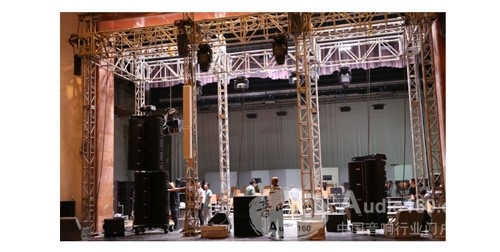 胡:視聽會26號下午2點正式開始,我們24號晚上就將設(shè)備運進場,25號早上搭設(shè)桁架,下午開始安裝和調(diào)試。主擴系統(tǒng)采用立體聲配置,我們在舞臺左右兩側(cè)各吊掛一個由6只Anya模塊構(gòu)成的陣列,每個Anya陣列下面堆疊3只Otto模塊,提供更多的低音支持。