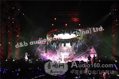 東莞站采取了三面看臺,中間為內場的常規表演模式。主擴聲系統選用d&b大型線陣列J-系列音箱懸掛于舞臺上方和兩側(包括J8全頻音箱、J12全頻音箱和J-SUB超低頻音箱)。在舞臺臺口也同樣配置了Q1全頻音箱、B2為前場補聲,使無論是內場還是山頂的觀眾都能夠感受一樣的音響效果。而返送選用了M4監聽音箱,全場使用D12功率放大器。