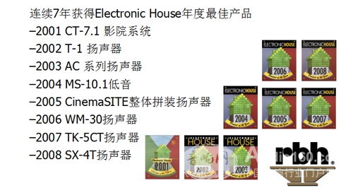 有業界奧斯卡之稱的Electronic House年度最佳獎項,RBH一拿就是連續7年的蟬聯;堪稱為業界產品詞典的Audioholic.com每年的年度Top100標志著業界每年的風向標,RBH也常年“居高不下”;如AudioRevolution.com、SoundStage!、EHX展會等權威媒體獎項,RBH也連年收入囊中。