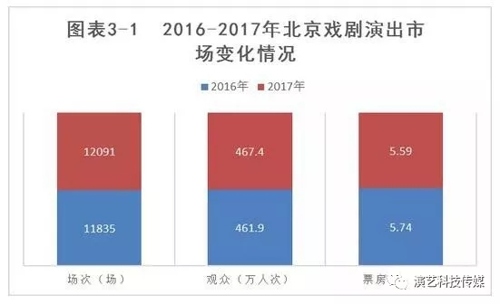 2017年,戲曲演出了2164場(chǎng), 比去年增加了8.3%。觀眾數(shù)量為89.1萬(wàn)人次,比2016年同期84.9萬(wàn)人次上升了4.8%;票房收入為0.81億,與2016年同期上升15.7%。北京市文化局積極落實(shí)《關(guān)于支持戲曲傳承發(fā)展實(shí)施意見》,通過出臺(tái)相應(yīng)扶持政策,提高戲曲劇目比重。同時(shí),傳統(tǒng)戲曲積極與現(xiàn)代媒體融合發(fā)展,通過“直播+戲曲”的模式,讓更多年輕人接觸戲曲、了解戲曲,并進(jìn)入現(xiàn)下現(xiàn)場(chǎng)欣賞戲曲。