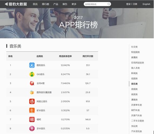 根據數據調查公司iiMedia Research所公布的數據,目前酷狗音樂占據中國在線音樂平臺28%的份額,位居第一。第二、三名的QQ音樂和酷我音樂分別為15%和13%。根據獵豹全球智庫的APP統計,酷狗音樂APP也以12.8%的周活躍滲透率穩居酷狗在線音樂APP霸主。