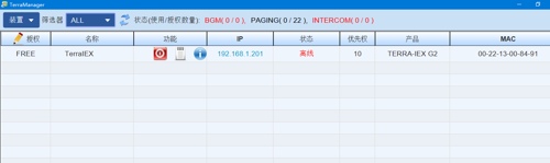 TERRA-Manager搭配TERRA-K或TERRA-SDM可實現(xiàn)和網(wǎng)絡中的終端進行廣播對講功能,軟件只需安裝在控制中心的計算機上,即可方便的通過軟件集中控制網(wǎng)絡中的所有設備,實時監(jiān)控設備的運行狀態(tài)。如圖所示,如果設備掉線,軟件“狀態(tài)”會顯示紅色字樣“離線”,如果設備在線,軟件會顯示綠色字樣“在線”。
