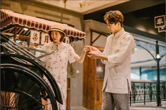 青磚灰瓦房,通透鏤空窗,霓虹燈下琉璃玻璃絢麗奪目,各家百年老店排布四周。老式電話亭、復古黃包車、民國畫報、火車驛站、凝香胭脂鋪……