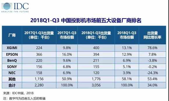 從廠商分布看,2018年前三季度投影機市場排名(按銷量計算)前五大廠商被XGIMI,Epson,BenQ,Sony,NEC占據(jù),極米首次登頂。