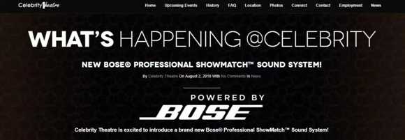 位于亞利桑那州鳳凰城的 Celebrity Theatre 對(duì)劇院內(nèi)的陣列系統(tǒng)進(jìn)行更新并從 Bose Professional 系列中選擇了 ShowMatch DeltaQ 系統(tǒng)進(jìn)行安裝八月,Celebrity Theatre 以傳奇藝術(shù)家Tony Bennett的精彩演出正式揭開了其經(jīng)過現(xiàn)代化改造后的神秘面紗。