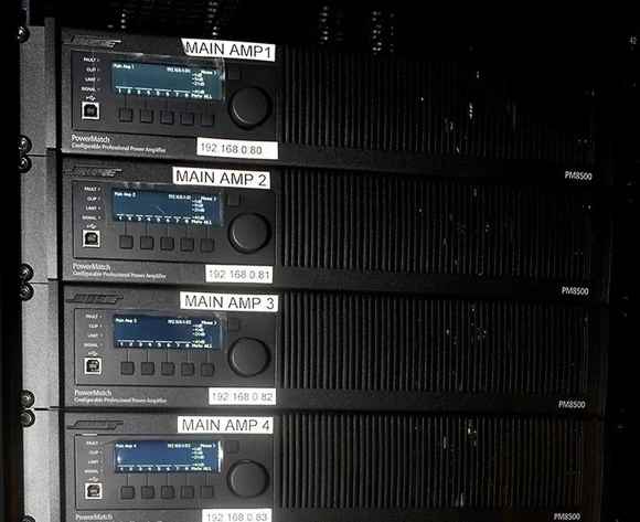 整套系統(tǒng)由 Bose ControlSpace ESP1280C 系列聲音處理器負(fù)責(zé)管理,其所需動(dòng)力則由 32 個(gè) Bose PowerMatch 8500N 功放共同提供。上述設(shè)備通過 Bose 專有的 AmpLink 卡進(jìn)行連接,每張卡最多可支持八個(gè)未壓縮數(shù)字音頻通道,所有數(shù)字音頻設(shè)備均采用菊花鏈的方式進(jìn)行連接。